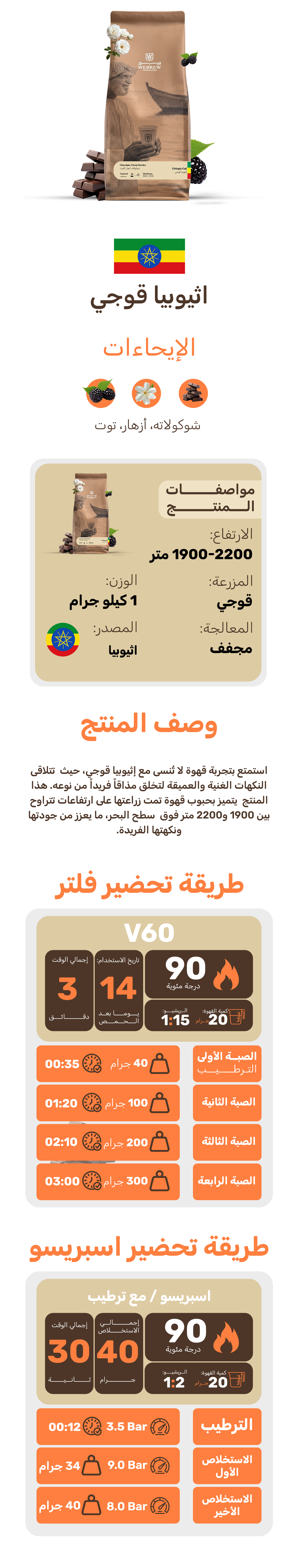 استمتع بتجربة قهوة لا تُنسى مع إثيوبيا قوجي، حيث تتلاقى النكهات الغنية والعميقة لتخلق مذاقاً فريداً من نوعه. هذا المنتج يتميز بحبوب قهوة تمت زراعتها على ارتفاعات تتراوح بين 1900 و2200 متر فوق سطح البحر، ما يعزز من جودتها ونكهتها الفريدة.