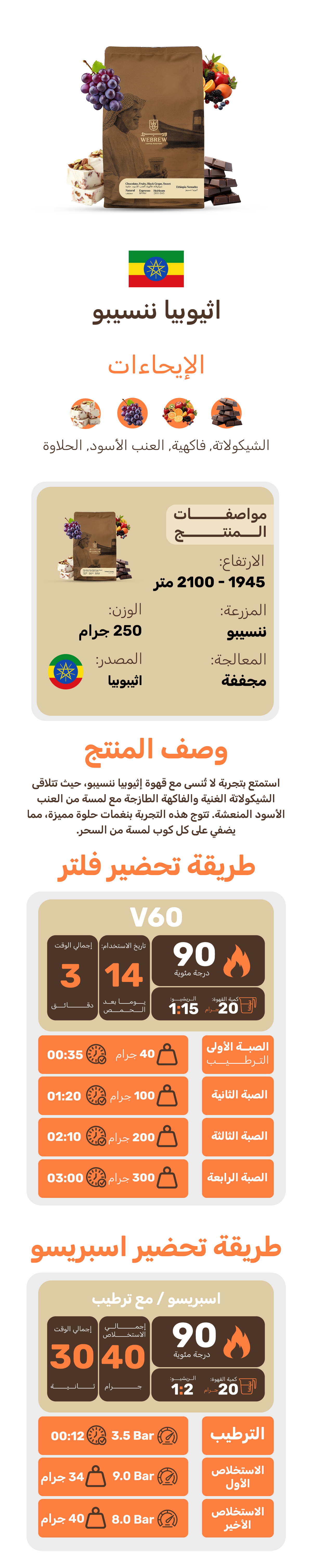 استمتع بتجربة لا تُنسى مع قهوة إثيوبيا ننسيبو، حيث تتلاقى الشيكولاتة الغنية والفاكهة الطازجة مع لمسة من العنب الأسود المنعشة. تتوج هذه التجربة بنغمات حلوة مميزة، مما يضفي على كل كوب لمسة من السحر.