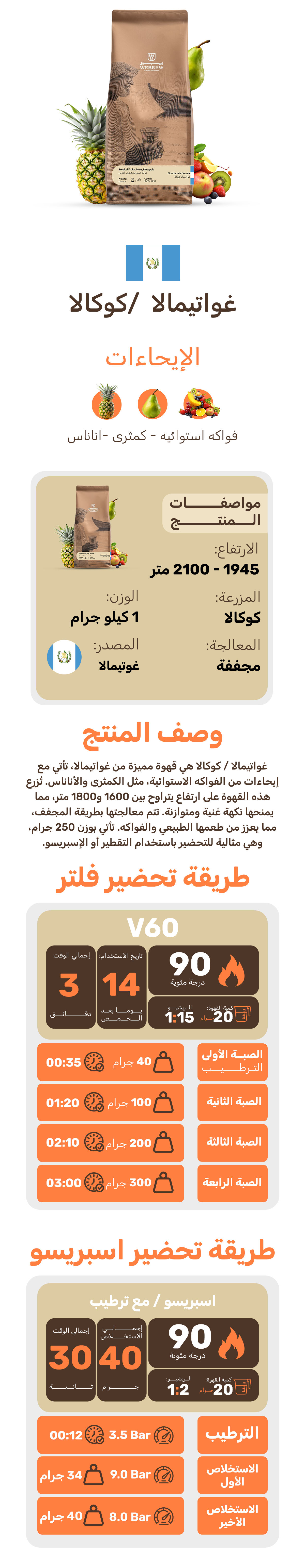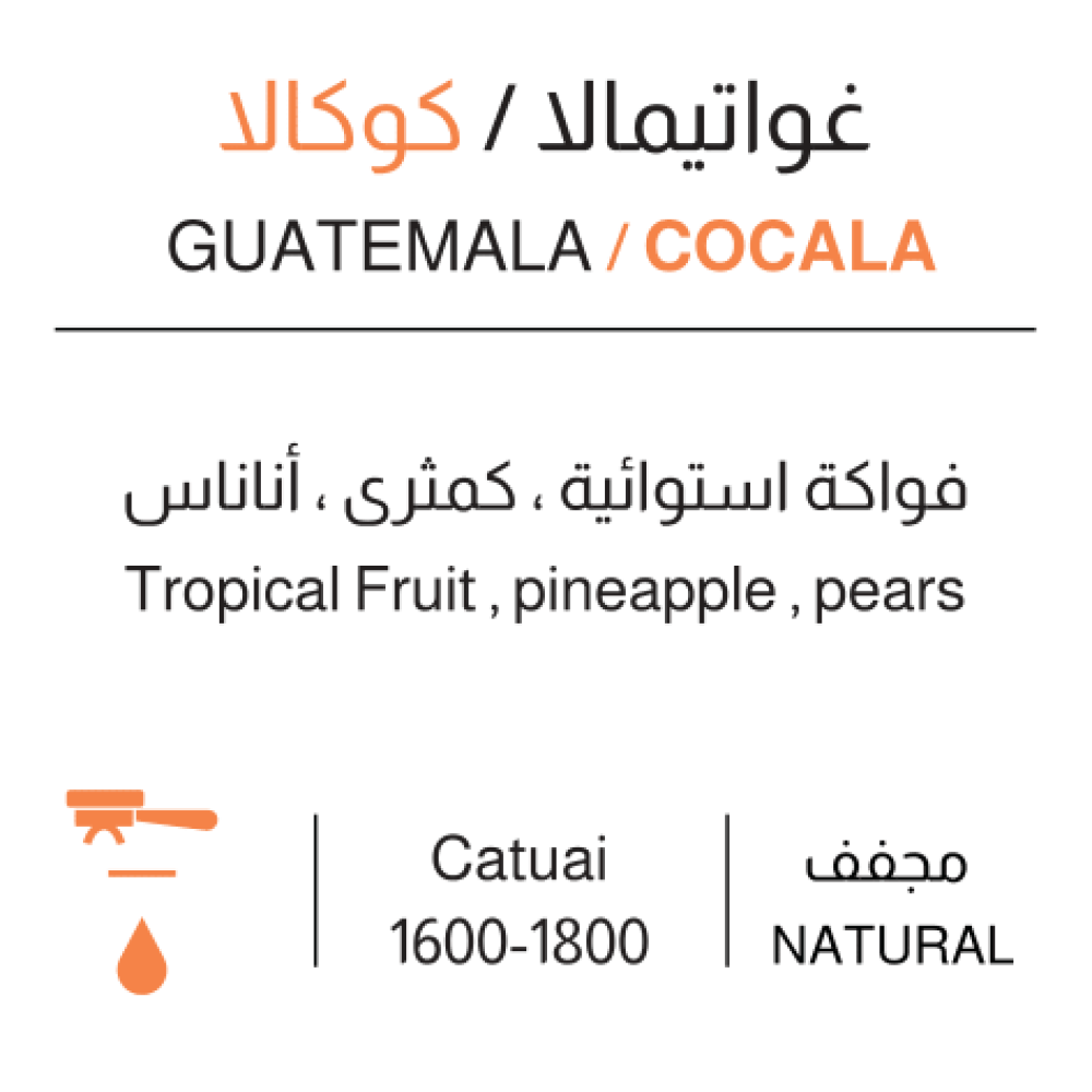 قهوة "غواتيمالا / كوكالا": هي قهوة مميزة من غواتيمالا، تأتي مع إيحاءات من الفواكه الاستوائية، مثل الكمثرى والأناناس. تُزرع هذه القهوة على ارتفاع يتراوح بين 1600 و1800 متر، مما يمنحها نكهة غنية ومتوازنة. تتم معالجتها بطريقة المجفف، مما يعزز من طعمها.