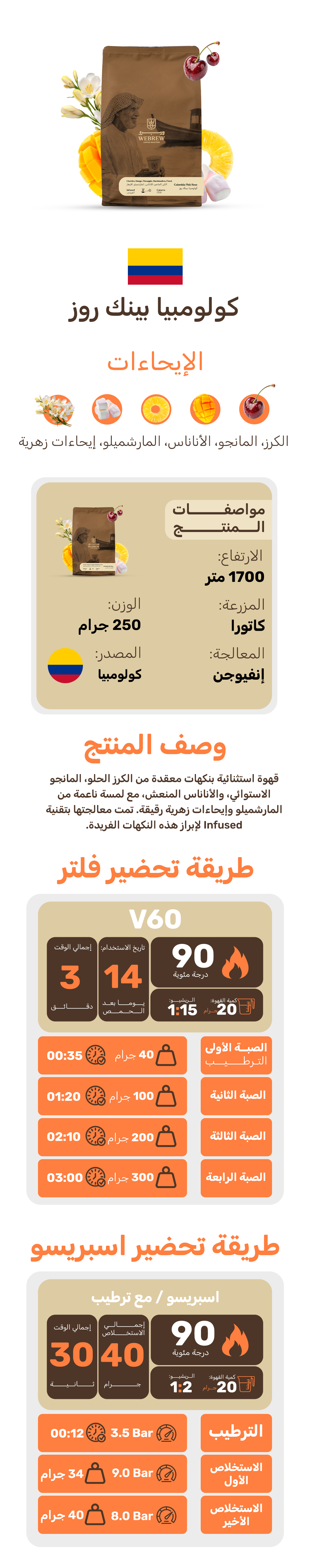 انغمس في تجربة قهوة استثنائية مع محصول "كولومبيا بينك روز" الفاخر. يتميز هذا المحصول بنكهاته الغنية والمعقدة التي تأخذك في رحلة عطرية فريدة من نوعها.